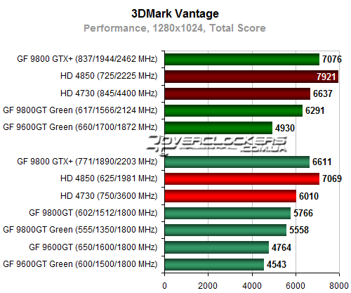 Radeon HD 4730 обгоняет GeForce 9800GT Green на 5% и GeForce 9800 GT на 10%. Разгон повышает результат карты Sapphire на 11%.