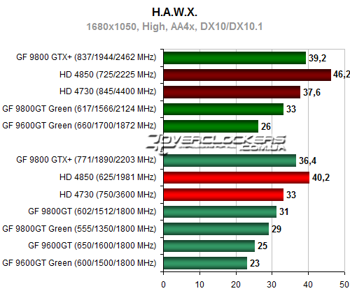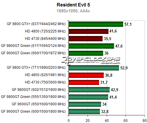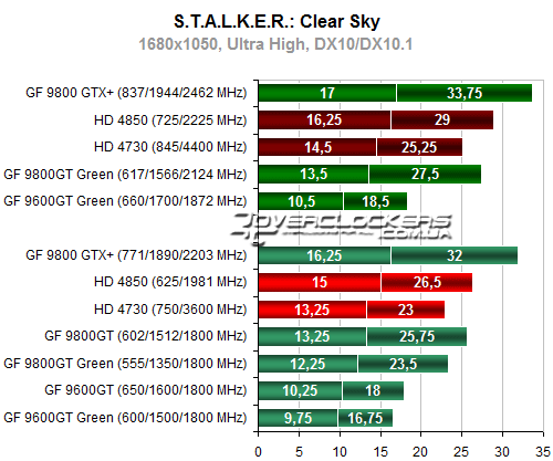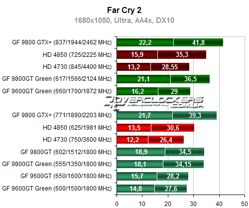 В этой игре разница между Radeon HD 4730 и GeForce 9800GT Green вновь незначительна, хотя по минимальному fps чуть лучший результат демонстрирует все же первый видеоадаптер.