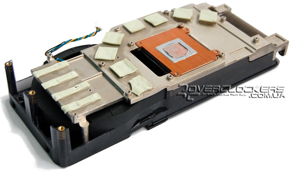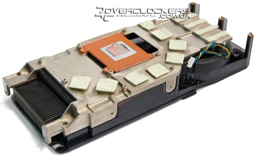 WinFast GTS 250 не отличается от своих собратьев, имеющих форму небольшого «кирпичика» благодаря массивной двухслотой системе охлаждения, выполненной по типу турбины с выхлопом горячего воздуха за пределы корпуса. Две толстые тепловые трубки контактируют с медным теплосъемником GPU и многочисленными ребрами радиатора. Все это крепится к большому алюминиевому основанию, которое через термопрокладки контактирует с микросхемами памяти.