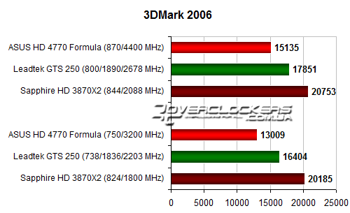 В 3DMark образца 2006 года старый Radeon HD 3870 X2 демонстрирует отличный результат, на 23% обходя GeForce GTS 250 и на 55% Radeon HD 4770.