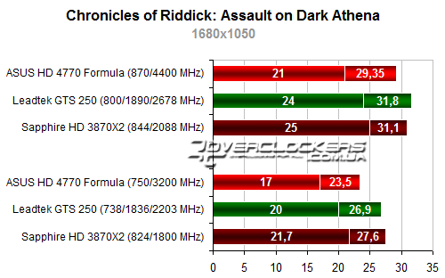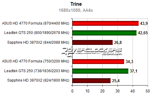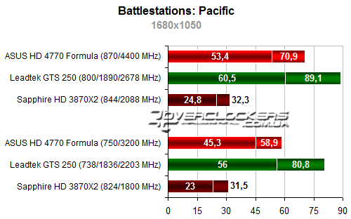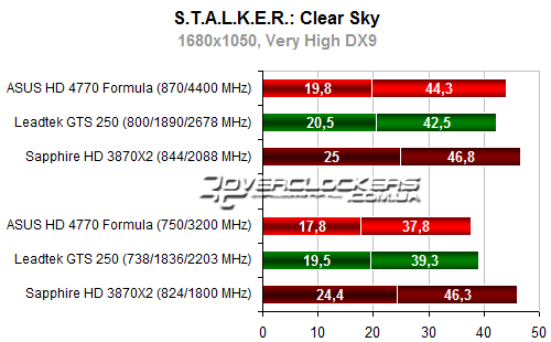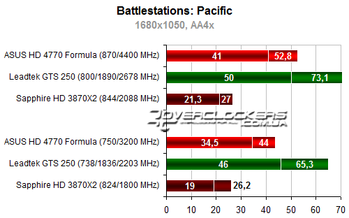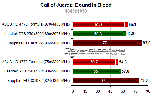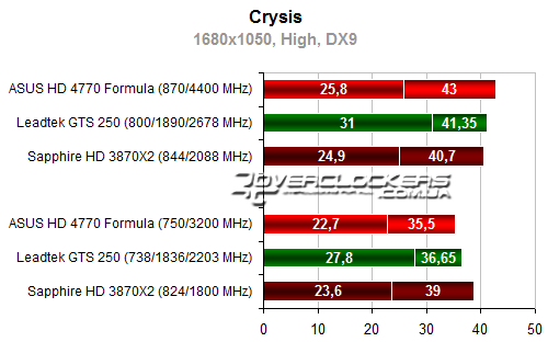 Radeon HD 3870 X2 снова является лидером, но отставание других карт невелико, и с разгоном только сокращается. Radeon HD 4770 выигрывает в противостоянии с GeForce GTS 250 за счет своего высокого частотного потенциала (и то, только по среднему fps, ведь минимальный все равно выше у карты NVIDIA).