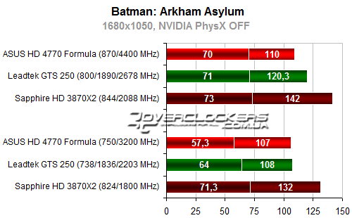 Новая игра в наших тестах. Мы использовали встроенный тест производительности в версии приложения 1.1. Batman: Arkham Asylum базируется на не требовательном движке Unreal Engine 3, но ряд визуальных эффектов добавляется при включении технологии NVIDIA PhysX. На картах AMD расчет этого физического движка ложится на «плечи» центрального процессора, что сильно ограничивает производительность. Так что мы провели два теста: первый при максимальных настройках графики, но с отключенным физическим движком в игре, второй — при включенном PhysX. Тест повторялся три раза для каждого режима.