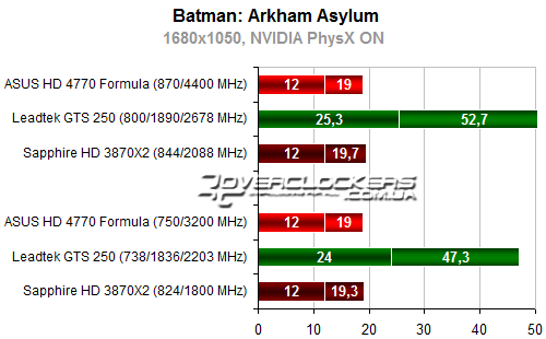 При включении NVIDIA PhysX мы видим, что на всех картах Radeon результаты практически одинаковы и средний fps не достигает и 20 кадров, что скорее уже характеризует возможности CPU в расчетах физического движка. На GeForce GTS 250 производительность тоже снизилась, но демонстрируемые результаты вполне приемлемы для комфортной игры. Разгон приносит мизерный прирост производительности для WinFast GTS 250, что вполне очевидно, ведь расчетами физики занимаются потоковые процессоры, а частота их поднялась лишь на 3%.