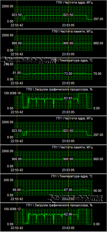 В номинальном режиме лучший результат у GeForce GTS 250, но уже в разгоне благодаря 28% приросту производительности Radeon HD 4770 немного обходит соперника. Показатели Radeon HD 3870 X2 вновь очень низкие, при том, что согласно графикам загрузки GPU, CrossFire работает, ведь задействованы оба ядра RV670.
