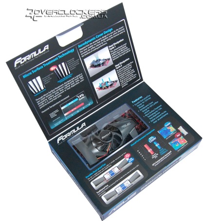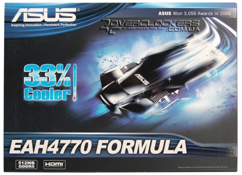 Видеоадаптер ASUS поставляется в большой коробке, на лицевой стороне которой есть надпись, гласящая о том, что охлаждение модели Formula на 33% эффективнее референсного кулера.
