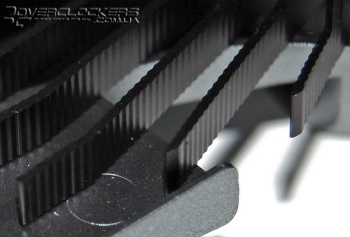 Но относительно референсного кулера у данной системы охлаждения преимущество все же есть. Во-первых, кроме того, что сам по себе радиатор у Formula обладает большими размерами относительно стандартной версии, его ребра еще имеют и особую рифленую поверхность, что позволяет еще дополнительно увеличить площадь рассеивания тепла на 14%.