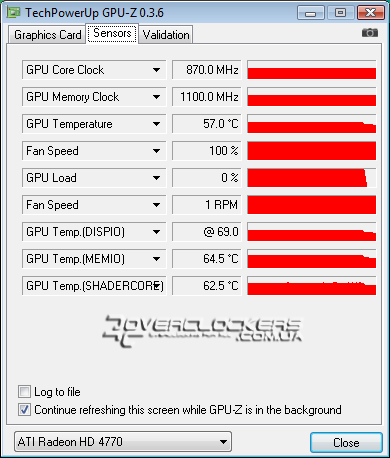 Для достижения полной стабильности работы в разгоне (в частности, для снижения температуры чипов памяти) обороты кулера пришлось поднять до 100%, что все равно не помешало температуре GPU немного подняться, и в стресс-тесте Fur Rendering Benchmark можно было наблюдать и 77 °C. В реальных игровых приложениях нагрев карты был ниже.