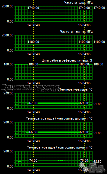 В самом тяжелом стресс-тесте — «бублике» Fur Rendering Benchmark, ядро едва прогревалось до 70 °C, самый горячий его компонент (контроллер памяти) достигал 73 °C.