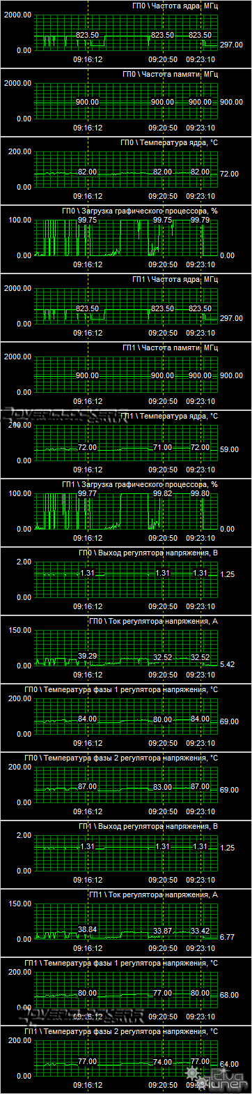 В игровых приложениях один GPU прогревался примерно до 82 °C и выше, температура другого была на 10 °C меньше. Поскольку стресс-тесты ATI-Tool и Fur Rendering Benchmark загружают лишь один графический чип, то на нижнем скриншоте приведены данные прогрева видеоадаптера по итогам двукратного прогона игровых тестов 3DMark Vantage.