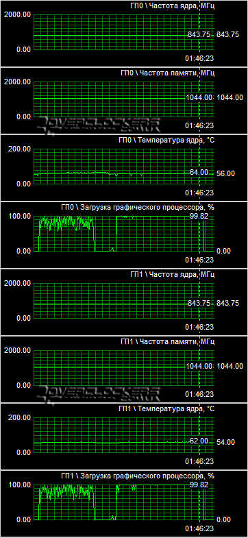 Разгон уперся в 844 МГц для GPU, при больших значениях начинали проявляться небольшие артефакты в 3D. Частоты памяти удалось поднять до 2088 МГц. Обороты вентилятора системы охлаждения были при этом выкручены на максимум, плата дополнительно обдувалась 80-мм вентилятором.