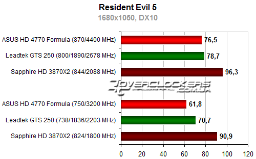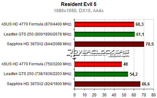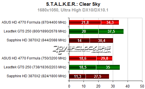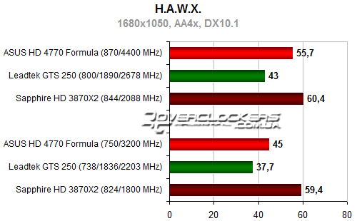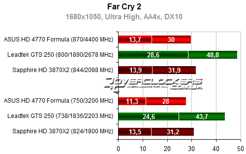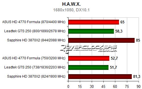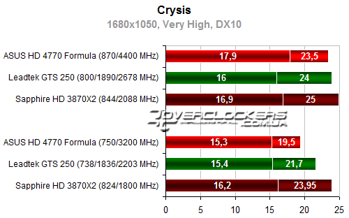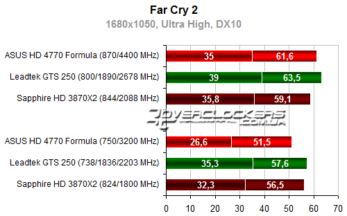 Radeon HD 3870 X2 снова является лидером, но отставание других карт невелико, и с разгоном только сокращается. Radeon HD 4770 выигрывает в противостоянии с GeForce GTS 250 за счет своего высокого частотного потенциала (и то, только по среднему fps, ведь минимальный все равно выше у карты NVIDIA).