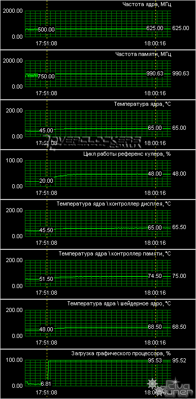 Работает видеокарта на частоте ядра 625 МГц, память на 1980 МГц. В простое частоты снижаются до 500 МГц и 1500 МГц. Кстати в очередной раз приходится наблюдать картину, когда под Windows XP рабочие частоты в покое все время прыгают, а вот под Windows Vista в 2D нормально фиксируются на минимальных значениях. В тесте «волосатым кубом» ATI Tool карта прогревается до 75 °C, при этом кулер раскручивается почти до 50% от своего максимума.