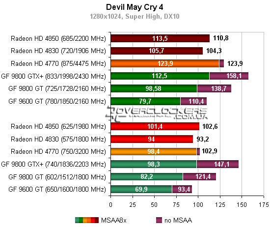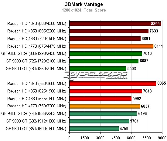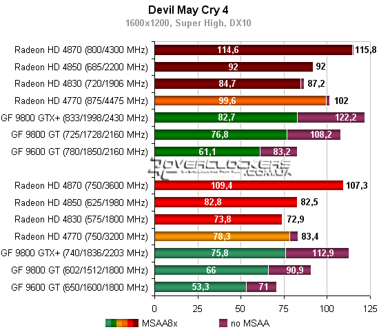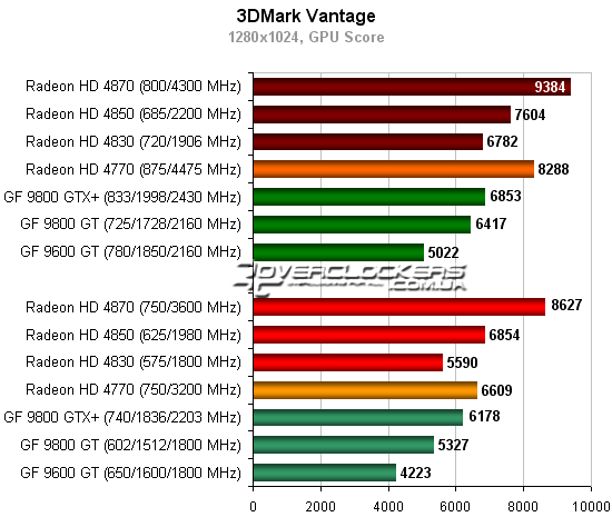 Снова новичок едва уступает Radeon HD 4850, легко обходит GeForce 9800 GT, а с GeForce 9800 GTX+ способен конкурировать лишь в разгоне.