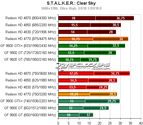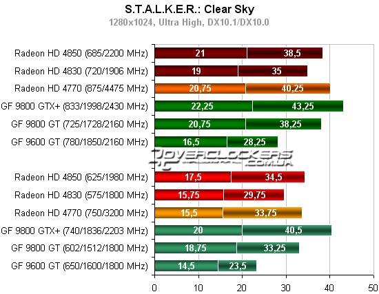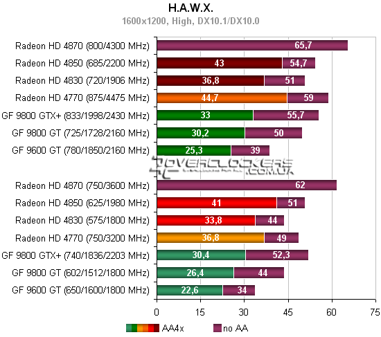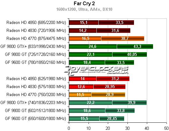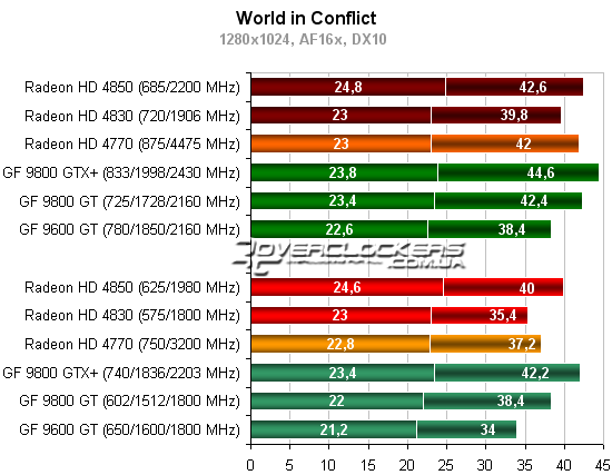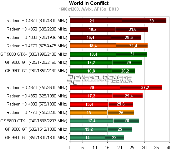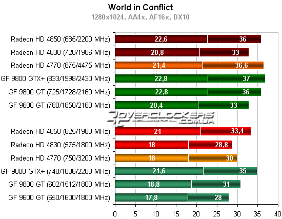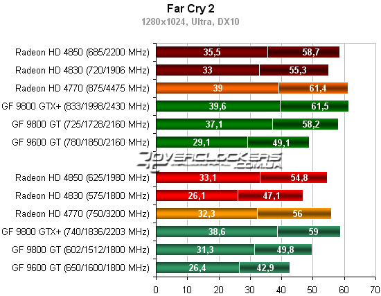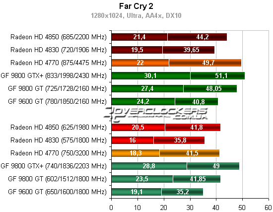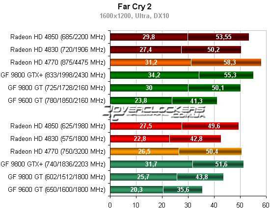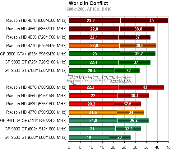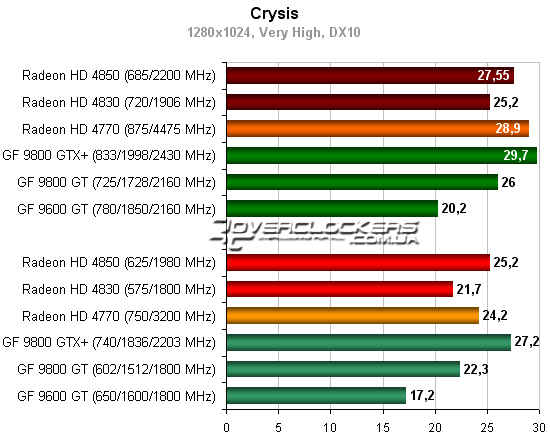 В низком разрешении на номинальных частотах все карты Radeon уступают GeForce 9800 GT, зато в высоком все складывается с точностью до наоборот. И именно в 1600х1200 с разгоном Radeon HD 4770 уже обходит остальные карты (кроме Radeon HD 4870).