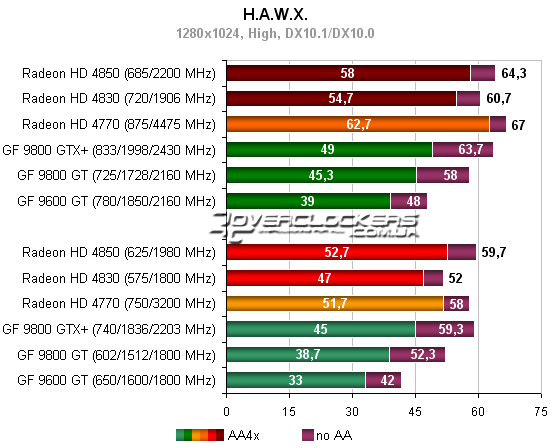 Radeon HD 4770, как говориться, «дышит в спину» Radeon HD 4850 и GeForce 9800 GTX+. Примечательно, что в этой игре активация сглаживания приводит к большему падению производительности уже на видеокартах GeForce. В таком режиме даже Radeon HD 4830 обгоняет видеокарты все NVIDIA.