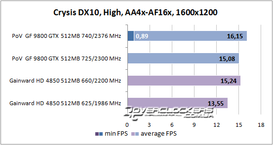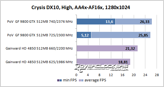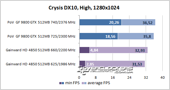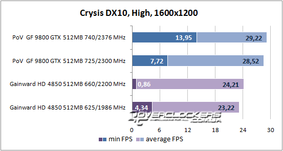 Увы, но чуда не произошло. В игре Crysis под DirectX 10 видеокарта Point of View GF9800GTX EXO демонстрирует куда больший результат, чем решение на базе Radeon HD 4850. Минимальный FPS на последнем выходит за рамки играбельности – постоянный своп, возможно, не дает полностью раскрыть потенциал карты. Почему именно проявлялась постоянная подгрузка уровня на Radeon HD 4850 осталась загадкой, ведь на GeForce 9800 GTX все работало нормально, даже не смотря на объем системной памяти в 2 ГБ.