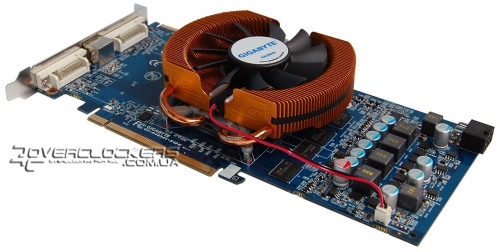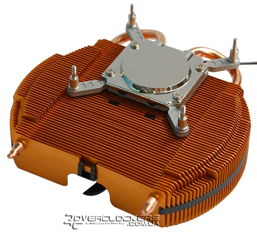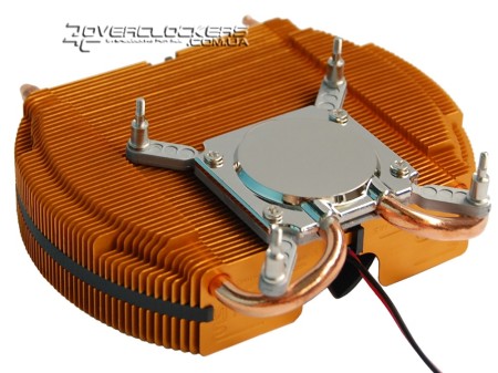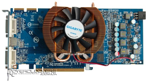 Графический чип охлаждается кулером Zalman VF830-AlCu, который вы не найдете в рознице, ведь выпускается он специально по OEM-заказу для производителей видеокарт. Его конструкция напоминает сильно «урезанный» Zalman VF1000. Число тепловых трубок уменьшено до двух, сами они тоньше, а ребра радиатора выполнены уже из алюминия. По габаритам конструкция почти не отличается от другого продукта этой же компании — VF900. Честно говоря, учитывая материал радиатора, и что главнее, невысокую площадь рассеивания, слабо верится, что данная система охлаждения справится с разгоном RV770, отличающегося высоким тепловыделением при повышенных частотах.