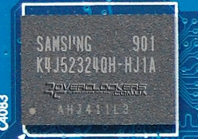 Восемь микросхем памяти GDDR3 производства Samsung общим объемом 512 МБ имеют время выборки 1 нс, что соответствует рабочей частоте в 2 ГГц.