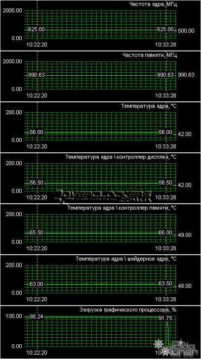 В стресс-тесте ATI Tool, который прогревает карту на уровне обычных игр, температура самого горячего компонента ядра, контроллера памяти, не превысила 66 °C, основной же датчик температуры вообще показывал лишь 57 °C.