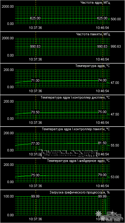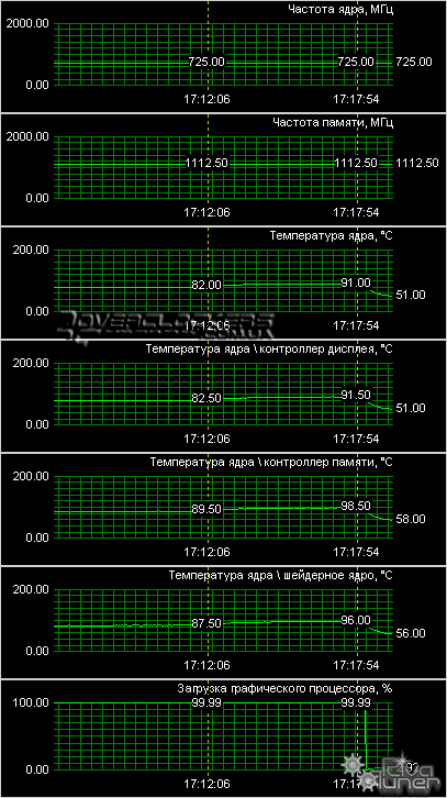 В нашем экземпляре повышение напряжения на памяти средствами Gamer HUD вообще никак не сказалось на ее разгоне, лишь артефакты начинали проявляться быстрее на очень высоких частотах. Не изменяя напряжение удалось достичь стабильных 2225 МГц, что для 1 нс памяти тоже очень неплохо. Ядро удалось разогнать до 725 МГц, более высокие значения приводили к нестабильной работе. В Fur Rendering Benchmark карта уже прогревалась почти до 100 °C!