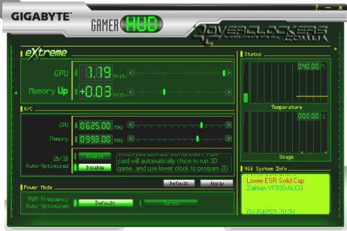 Для разгона и мониторинга за температурой пользователь может использовать выше упоминавшуюся утилиту Gamer HUD. Она позволяет поднимать частоты ядра с шагом 5 МГц вплоть до 750 МГц, памяти до 1198 МГц (эффективная 2396 МГц). Есть и возможность регулирования напряжения на ядре и памяти. Но, к сожалению, на ядре RV770 напряжение регулируется лишь в меньшую сторону от 1,19 до 0,89 В с шагом 0,05 В, что не позволяет надеяться на какие-то феноменальные результаты разгона. Впрочем у обычной карты серии HD 4850 на чип в 3D режиме подается напряжение 1,158 В, так что небольшой «запас» у нашей карты все же есть. А вот на чипах памяти напряжение можно поднять до +0,09 В с шагом 0,03 В. Но с такой небольшой дельтой тоже не стоит рассчитывать на большой прирост, такими ограничениями производитель скорее снижает вероятность выхода из строя памяти в результате разгона.