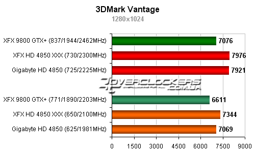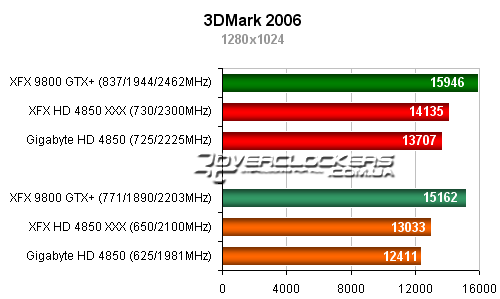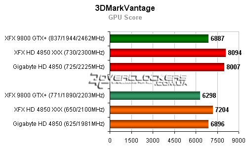 В последнем 3DMark преимущество уже на стороне видеоадаптеров Radeon. По очкам GPU-тестов XFX GeForce 9800GTX+ отстает от модели Gigabyte на 10%.