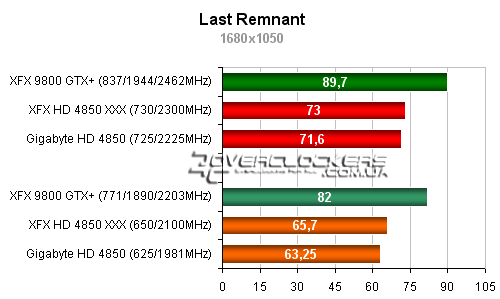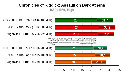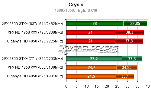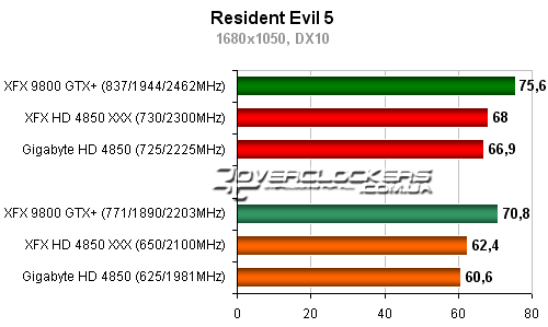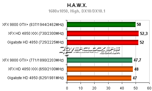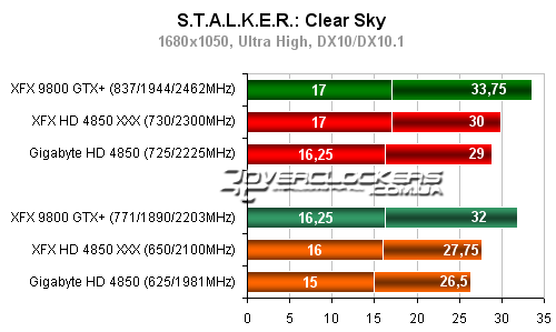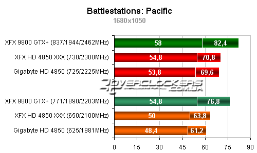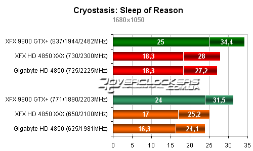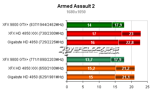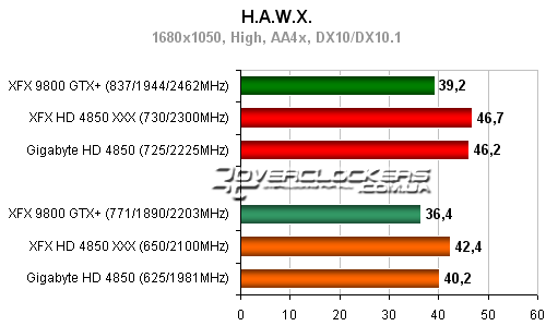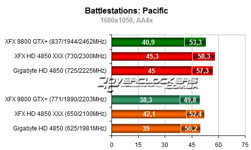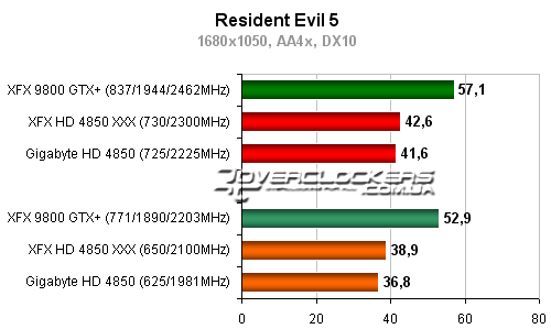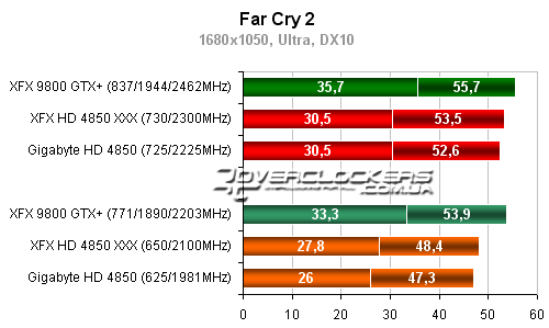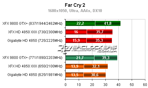 Разница между разогнанным Radeon HD 4850 от XFX и картой Gigabyte около 5-6%. Обе они уступают в этой игре 9800GTX+.