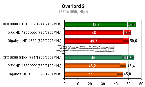 В этой игре довольно большое преимущество по среднеигровому fps у карты 9800GTX+, которая обгоняет соперников на 24-29%. И хотя разгон обоих Radeon приносит им более 10% прироста производительности, но догнать конкурента они все равно не могут. Впрочем, и таких показателей с лихвой хватит для комфортной игры.