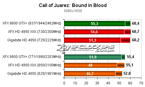 Памятуя былую любовь первого Call of Juarez к продуктам AMD (а тогда еще ATI), немного неожиданно видеть, что по всем показателям лучший результат у GeForce 9800GTX+, хотя XFX HD 4850 512 MB DDR3 XXX вплотную приближается к сопернику в разгоне.