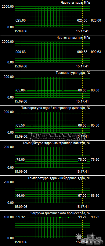 Для мониторинга и разгона карты использовалась утилита RivaTuner 2.11. Ядро работает на положенных 625 МГц, а память на 1981 МГц, что немного ниже рекомендованных 2000 МГц. В простое частота чипа снижается до 500 МГц. Видеокарта имеет несколько термодатчиков. Кроме главного датчика графического ядра, есть и другие встроенные датчики, в том числе шейдерного домена. Система охлаждения отлично справляется со своей задачей, и под нагрузкой температура чипа не превысила 66 °C. Более высокая температура была у контроллера памяти – 75 °C. Это намного ниже температуры ядра 90-95 °C на референсной турбине, и заметьте, при довольно простой конструкции кулера и без каких-либо тепловых трубок. Шум, создаваемый вентилятором, заметен на фоне системы, но все равно меньше, чем у референсного кулера под нагрузкой. Обороты кулера никак не регулируются.