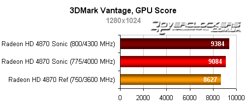 Примерно 5% преимущество Radeon HD 4870 Sonic над картами со стандартными частотами. Разгон повышает результат примерно еще на 3%.