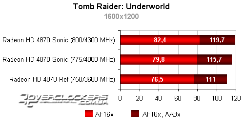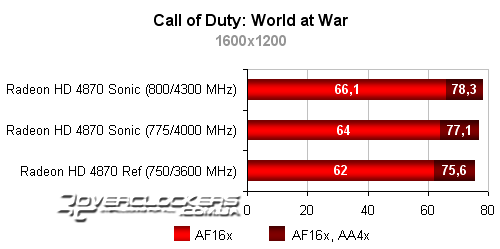 Разница Radeon HD 4870 Sonic с обычной картой около 4%, разгон приносит еще 3%. Такие результаты, несмотря на большую разницу в частотах памяти, указывают на то, что в данной игре основную роль играет частота графического ядра.