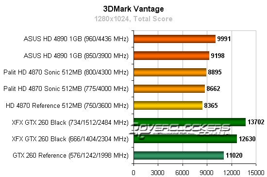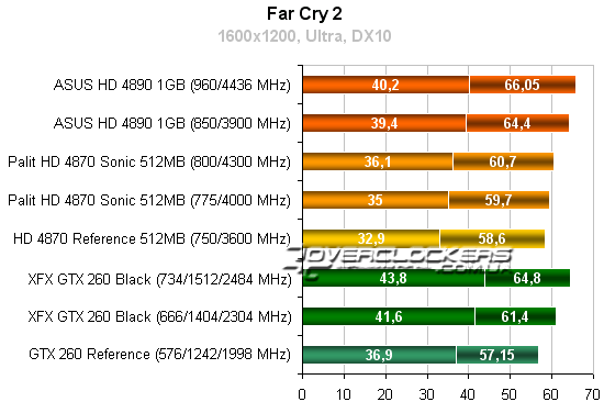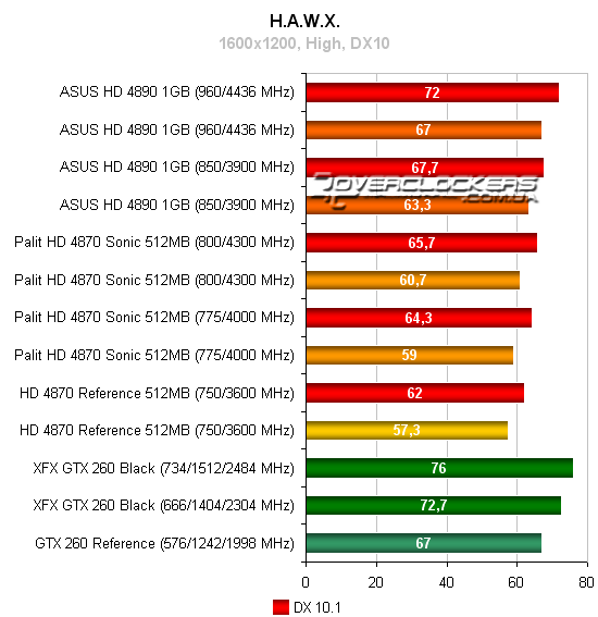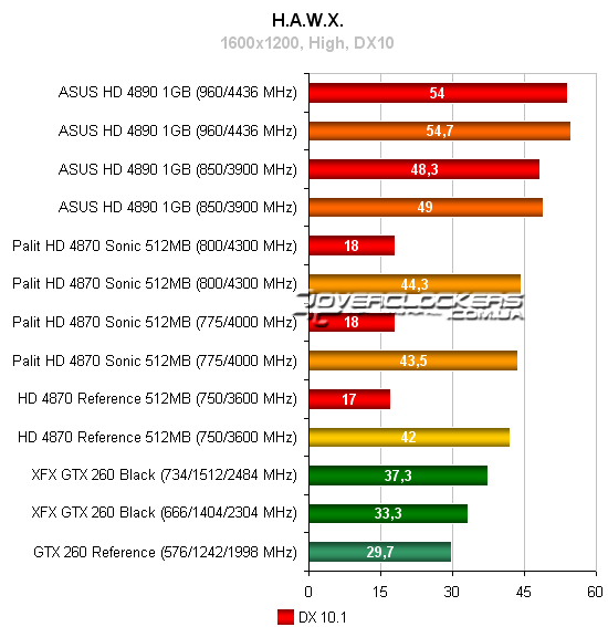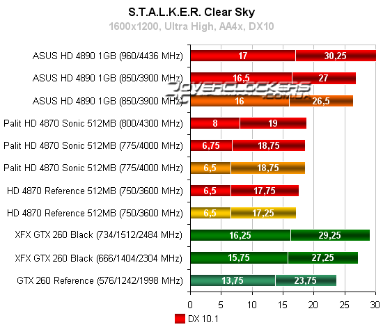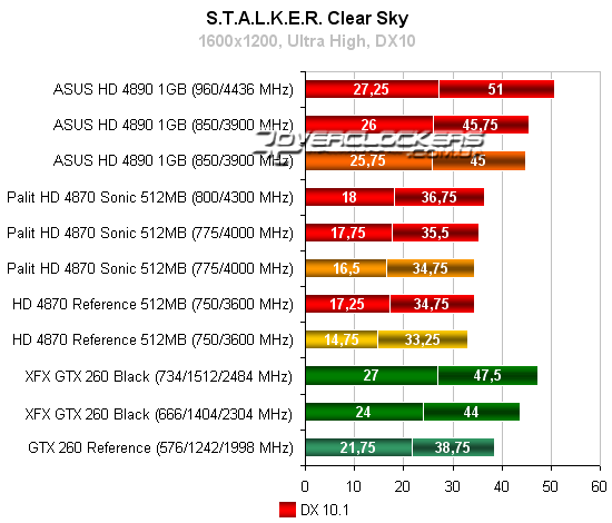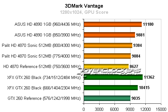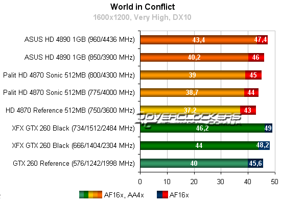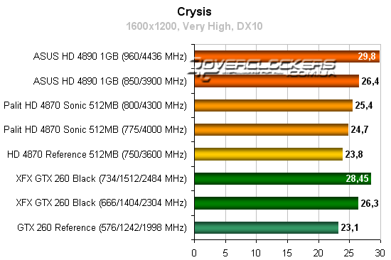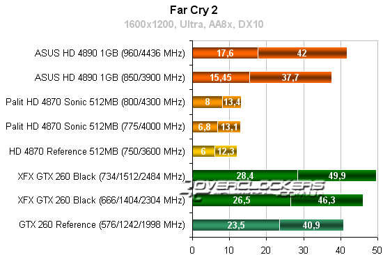 Radeon HD 4890 незначительно опережает референсный GeForce GTX 260, но конкурировать с разогнанной картой NVIDIA не может даже при повышении своих частот. Radeon HD 4870 Sonic достичь результатов конкурента GeForce не помогает и разгон.