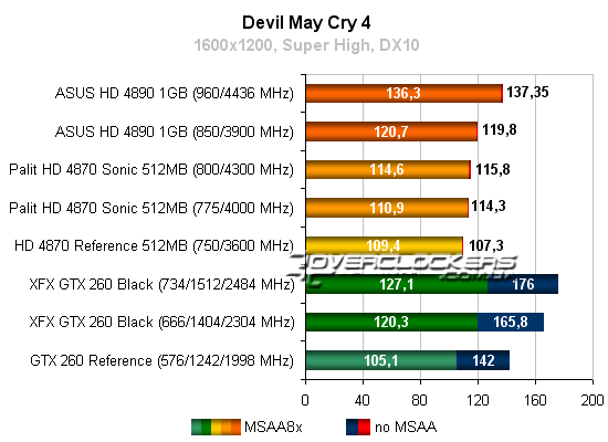 Еще при первой нашей встрече с видеокартами Radeon HD 48xx мы столкнулись со странной ситуацией в игре Devil May Cry 4, когда при активации мультисемплинга результат повышается. С новыми драйверами производительность у Radeon в этой игре поднялась, но все равно при активации MSSA наблюдается хоть и мизерное, но повышение результата. В общем-то, используемый игровой бенчмарк имеет небольшую погрешность, и полученная разница вполне в эту погрешность вписывается. Но когда подобное соотношение результатов повторяется из раза в раз, то это не уже не погрешность, а закономерность. Мы даже повторно протестировали карты Radeon, но соотношение результатов без MSSA и с ним почти не изменилось. Тут надо бы еще отметить, что в наших тестах у боле слабых карт, как Radeon HD 4670, наблюдалось небольшое падение производительности, а у Radeon HD 4830 уже нет (но и результат не повышался). Первое, что приходит в голову, — сглаживание на самом деле не работает. Но в сравнительном тестировании Radeon HD 4830 и GeForce 8800GT мы доказали, что оно работает, и на таком же уровне как и у GeForce, но зато без падения производительности. Вот и сейчас мы сделали несколько скриншотов, и снова убедились, что сглаживание работает. А вот почему же нет падения производительности (едва заметно только на разогнанном Radeon HD 4890) не ясно. Но в любом случае это лишь плюс видеокарт AMD.