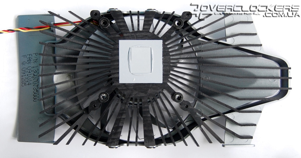 Алюминиевый радиатор состоит из множества расходящихся в стороны пластин, образующих подобие «звезды». Ребра имеют рифленую поверхность, увеличивающую площадь рассеивания. Производитель заявляет о том, что данная система охлаждения эффективнее референсной на 14%. И действительно, температура чипа в работе довольно низкая, но и шум кулера высоковат.