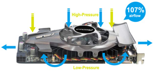 Система охлаждения кроме броского внешнего вида обладает и некоторыми практическими преимуществами относительно стандартного эталонного кулера, устанавливаемого на карты этой серии. По заявлению производителя специфичная форма крышки системы охлаждения помогает равномернее распределить воздушный поток, который обдувает всю поверхность платы.