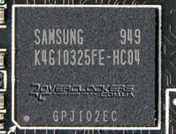На акселераторе распаяно четыре микросхемы памяти Samsung K4G10325FE-HC04, которые рассчитаны на рабочую частоту в 5 ГГц QDR, что выше номинальных 4,6 ГГц для этой карты. Так что небольшой «запас» для разгона памяти еще имеется.