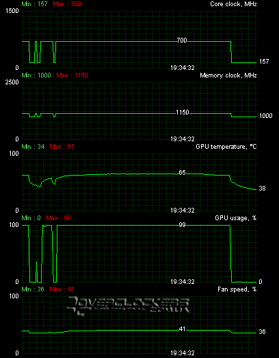 В простое частота GPU снижается до 157 МГц. Температура в 2D не достигала и 40 °C, в 3D-приложениях поднималась примерно до 60 °C (при 20 °C в помещении). В течение двенадцатиминутного прогрева стресс-тестом Fur Rendering Benchmark при разрешении 1680х1050 ядро разогрелось лишь до 65 °C.