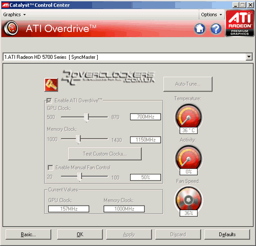 Для разгона, кроме уже упоминавшейся программы MSI Afterburner, можно использовать и стандартное приложение ATI Overdrive, которое входит в Catalyst Control Center. Но в нем максимальный разгон по ядру ограничен значением 870 МГц, а память выше 1430 МГц (эффективные 5720 МГц) не поднимается.