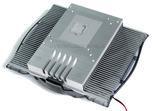Конструкция кулера не самая удачная в том плане, что основание радиатора частично мешает обдуву микросхем памяти и платы. Да и площадь рассеивания тоже невелика, но конструкторы компенсировали это большим вентилятором с диаметром крыльчатки 85 мм.