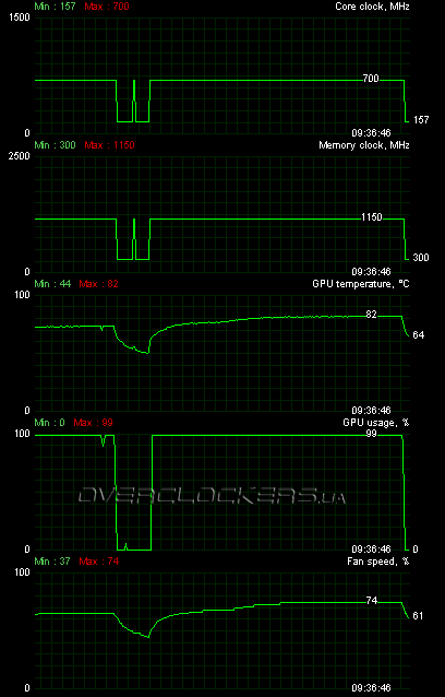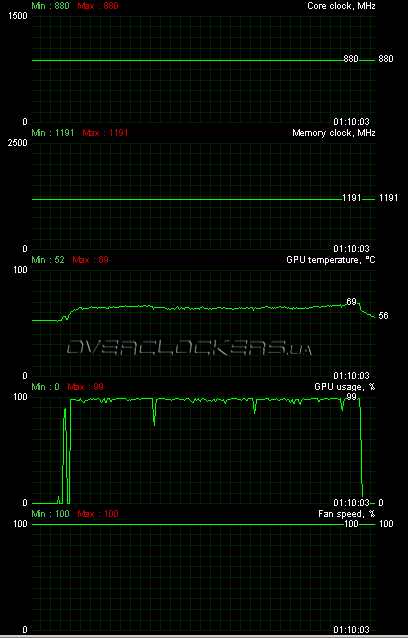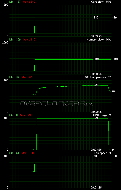 В таком режиме при максимальных оборотах вентилятора системы охлаждения температура ядра в Crysis Warhead едва достигала 69 °C, а в Fur Rendering Benchmark не превышала 85 °C.