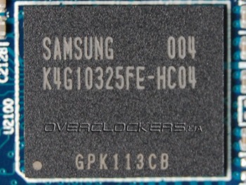 Распаяны уже привычные микросхемы памяти Samsung K4G10325FE-HC04, общим объемом в 1 ГБ.