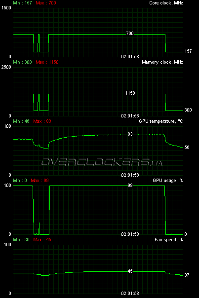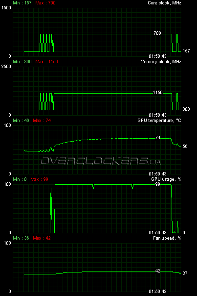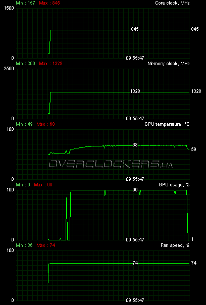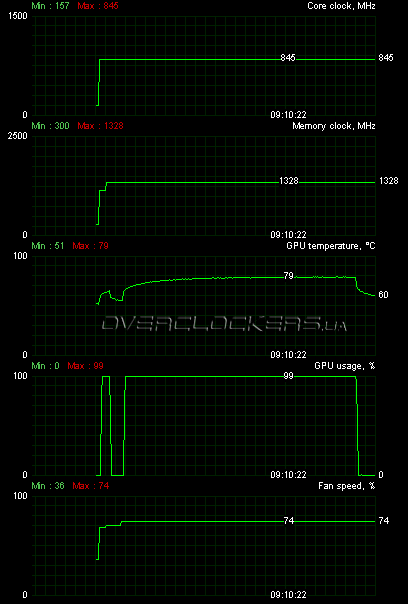Разгон данной модели составил 845/5312 МГц. С учетом отличной эффективности родного кулера, мы решили проверить работоспособность на таких частотах в автоматическом режиме управления оборотами, но карта не выдержала полностью даже испытание игрой Crysis, хотя ядро не успело прогреться выше 76 °С. Причиной может быть перегрев силовых элементов цепи питания — они напрямую хоть и не обдуваются, но повышенные обороты помогут снизить не только температуру GPU, но и нагрев платы со всеми компонентами на ней. «Разогнав» вентилятор турбины до 75% мы достигли полной стабильности во всех тестах. При этом температура GPU в игровом тесте не превысила 68 °С, а в Fur Rendering Benchmark — 79 °С.