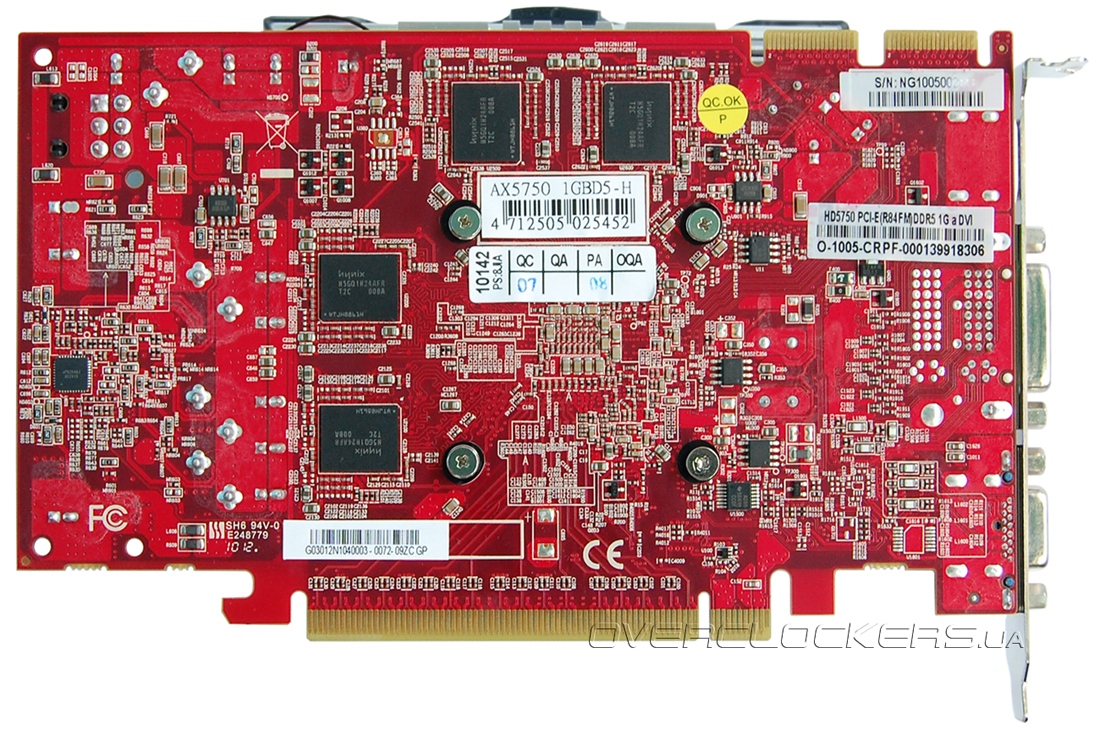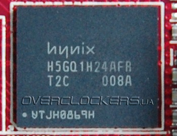 Вместо уже привычных микросхем Samsung с двух сторон платы распаяны восемь чипов Hynix H5GQ1H24AFR-T2C общим объемом в один гигабайт. Согласно маркировке эти микросхемы изначально рассчитаны на рабочую частоту в 5 ГГц при рабочем напряжении 1,5 В.