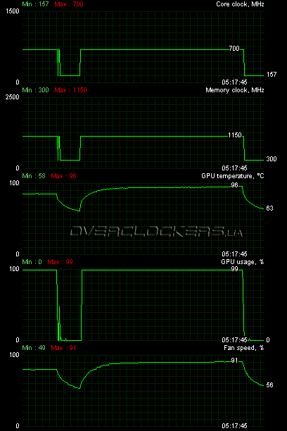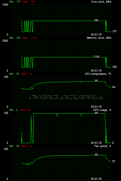 GPU прогрелся до 86 °С после 12-минутного прогона Ambush из Crysis Warhead Benchmarking Tool в разрешении 1920х1200 при максимальных настройках качества. Вентилятор на кулере раскрутился до 80%, создавая весьма заметный гул.