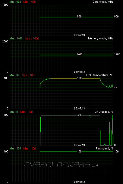 Разгонный потенциал у AX5750 1GBD5-H оказался отличным. Графический процессор смог работать на 900 МГц, а память на 1400 МГц (5600 МГц). В стресс-тесте видеоадаптер быстро прогревался до ужасающих 106 °С даже при максимальных оборотах вентилятора системы охлаждения. Но, к удивлению, даже при таком нагреве удалось пройти 12-минутный тест.