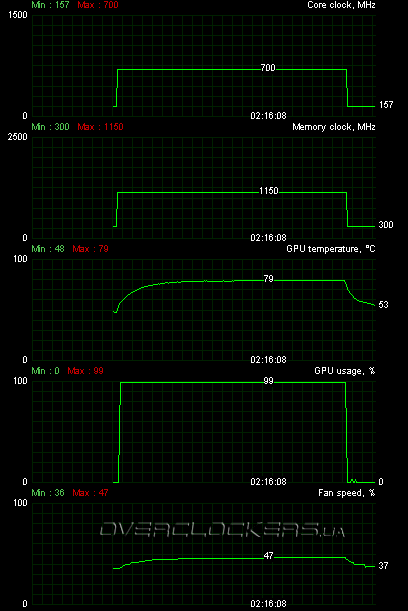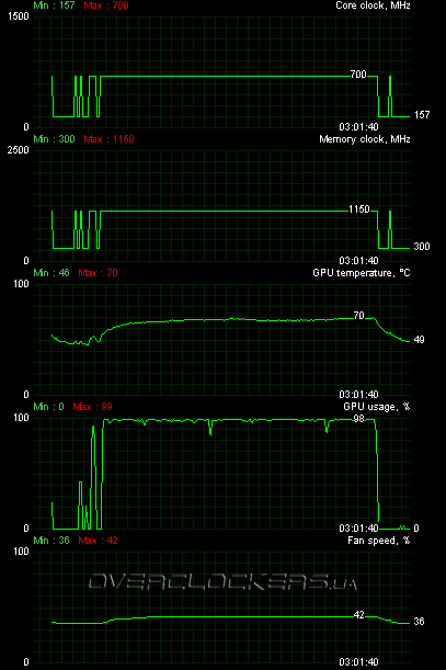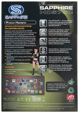 Не выделяясь на фоне других решений, Sapphire HD5750 512M GDDR5 функционирует на частотах 700/4600 МГц. В простое, как и положено, частоты снижаются до уровня 157/1200 МГц.