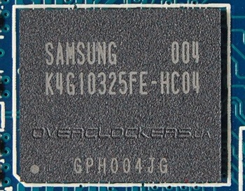 В качестве чипов памяти используются уже знакомые нам микросхемы K4G10325FE-HC04 от Samsung. Общий объем памяти — 512 МБ.