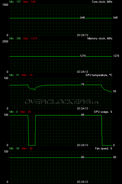 А вот разгонный потенциал у данной видеокарты оказался средненьким. Ядро стабильно заработало на 845 МГц, память покорила лишь 5112 МГц. Зато для полной стабильности даже не пришлось выкручивать на максимум обороты вентилятора. Достаточно было установить его на 80% для прохождения стресс-теста, и температура при этом не превышала 78 °C. В играх можно было еще убавить обороты.