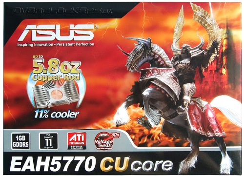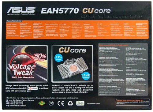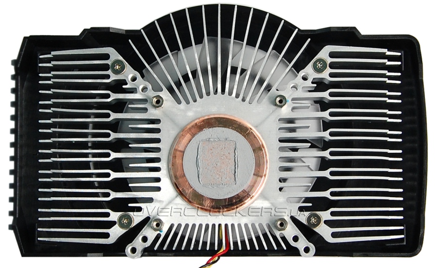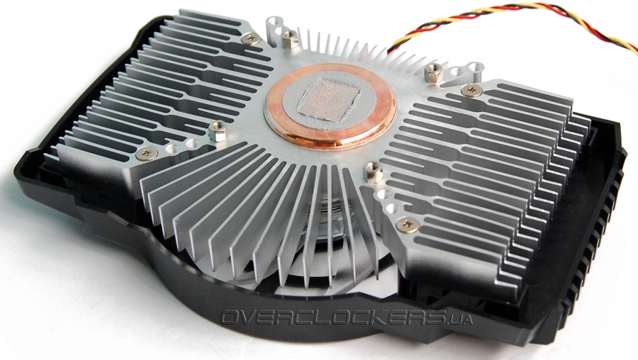 Впрочем, кроме внешнего вида претензии у нас есть и к конструкции кулера, ведь под большим кожухом скрывается тонкий алюминиевый радиатор. Из-за маленькой высоты площадь рассеивания у него вряд ли больше чем у кулера EAH5770/2DI/512MD5. Медная вставка имеет вес 5,8 унций (как и у предшественника). Диаметр лопастей вентилятора — 75 мм. Фактически никаких конструктивных улучшений системы охлаждения видеокарты CUCore EAH5770 относительно системы охлаждения EAH5770/2DI нет.
